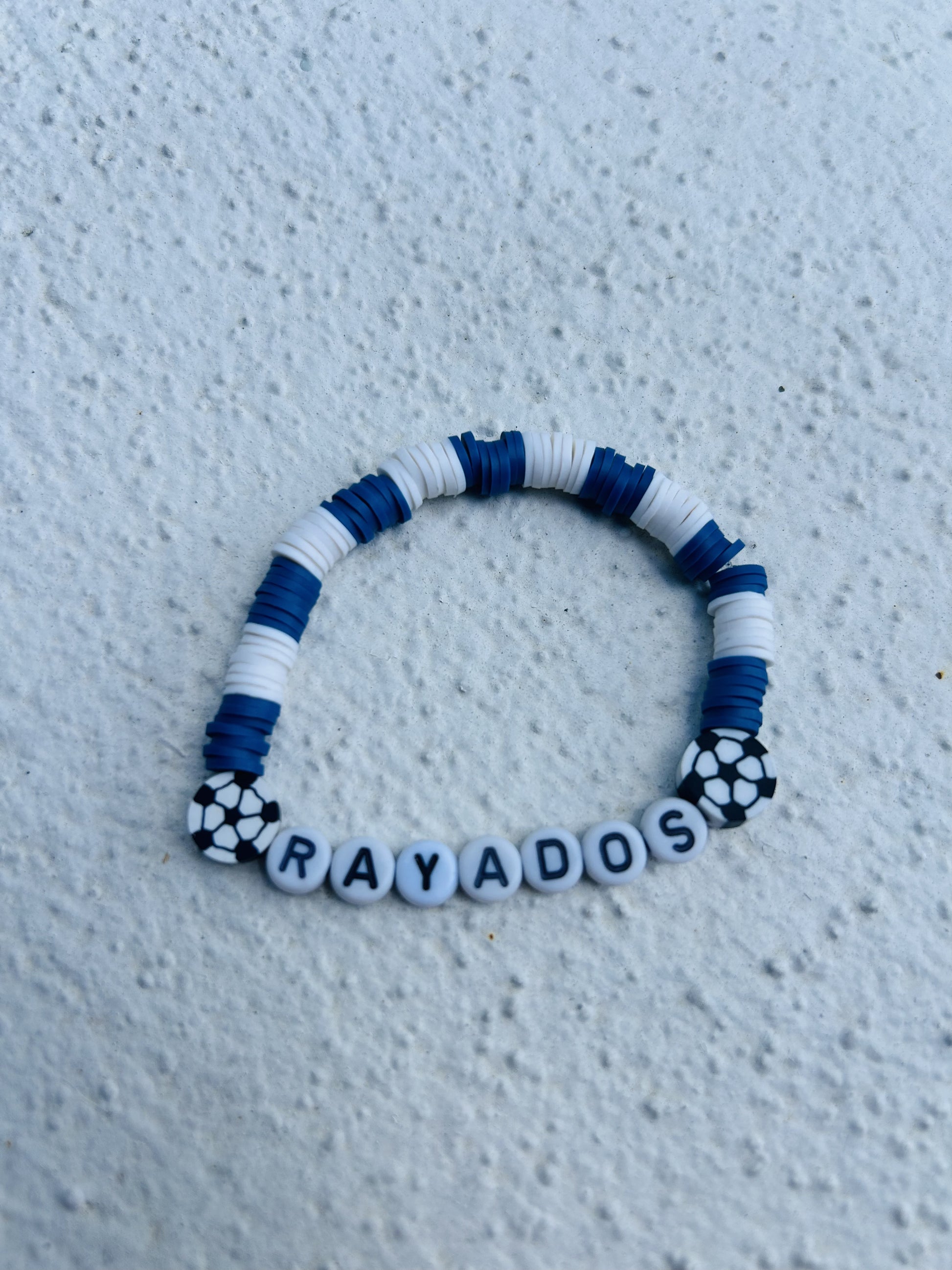 Show your love for Rayados with this handmade bracelet inspired by the colors of Club de Fútbol Monterrey. Featuring blue, white beads and the word "Rayados", it's a perfect accessory for loyal fans and collectors. Wear your team pride everywhere you go! 💙⚽